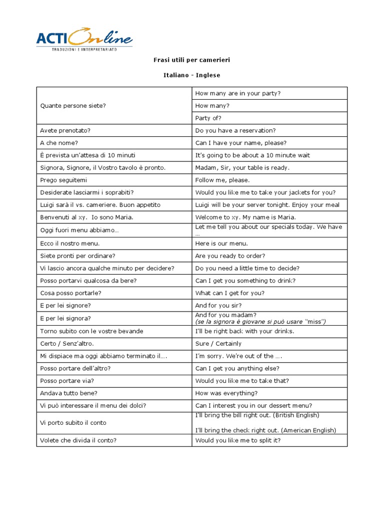 Ecco una lista utile di esempi di conversazioni che potreste dover affrontare. Do you have a reservation. Prego seguitemi follow me please. Frasi utili per camerieri italiano inglese quante persone siete.